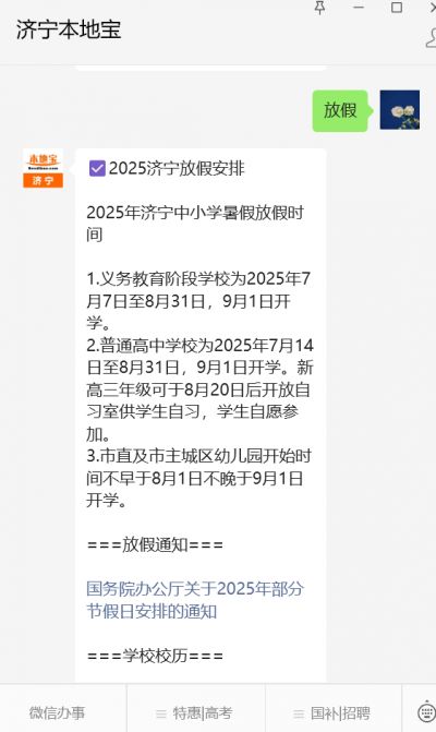 微信搜索公众号【济宁本地宝】,关注后在对话框回复【放假】可获取济宁各学段(大/中/小/幼儿园)放假时间,全年放假安排、最新放假通知、学校校历等信息