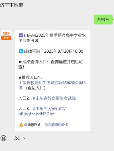 温馨提示:微信搜索公众号【济宁本地宝】,关注后在对话框回复【合格考】可获取山东合格考考试最新消息:考试成绩查询时间/入口、成绩复核方式、咨询电话、密码